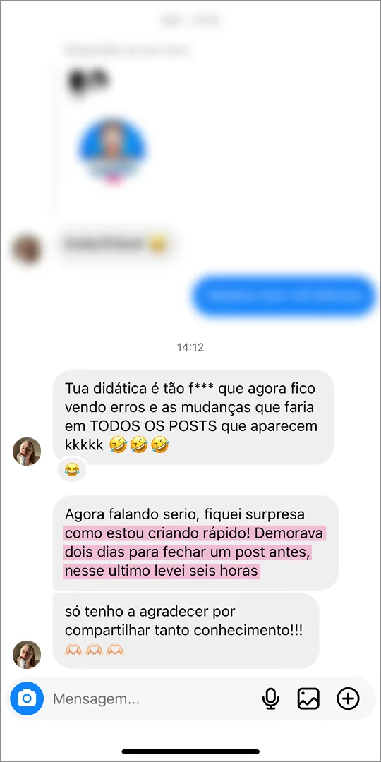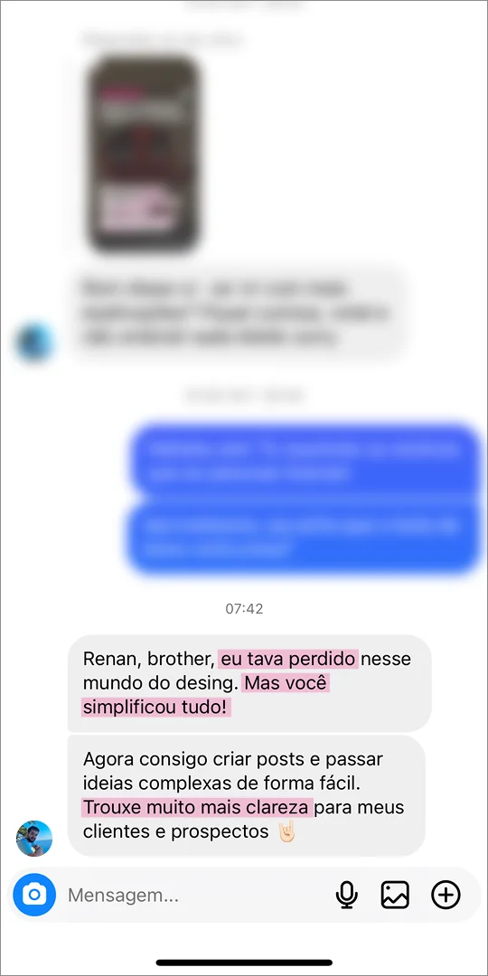 “Demorava semanas para criar um post carrossel simples e achava sem graça, desconectado da minha marca. O DesignTelling me deu uma nova perspectiva e passei a conseguir tomar decisões mais inteligentes. Fui percebendo que o que me impedia de produzir meus próprios conteúdos não era falta de tempo ou habilidade, mas de repertório. Toda a parte didática é muito boa porque ele não só explica, ele MOSTRA, ele escancara pra você a diferença que os detalhes fazem. O cuidado que existe aqui eu nunca vi em nenhum outro lugar, e olha que eu já tinha procurado bastante. O Renan me mostrou que sou capaz de fazer conteúdos com muito mais qualidade do que eu esperava.”
